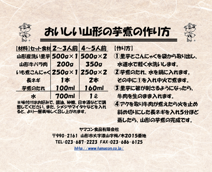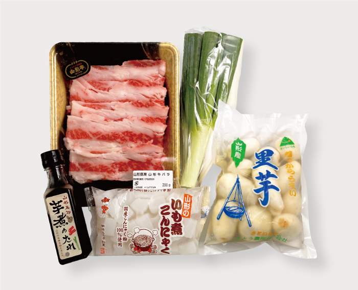 山形牛、山形県産里芋、国産ネギ、自社製造 芋煮こんにゃく(国産)、