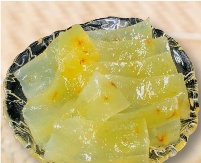 山形県花の紅花が入った爽やかな黄色に染まったさしみこんにゃくです。